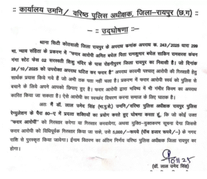 रायपुर पुलिस की ओर से जारी उद्घोषणा के मुताबिक, फरार आरोपी अमित बघेल पिता रामकुमार बघेल, निवासी रोहनीपुरम, रायपुर, 28 अक्टूबर को अपराध घटित करने के बाद से फरार है। पुलिस ने कहा कि आरोपी के स्वतंत्र रूप से घूमने से समाज की शांति और सुरक्षा को खतरा हो सकता है।