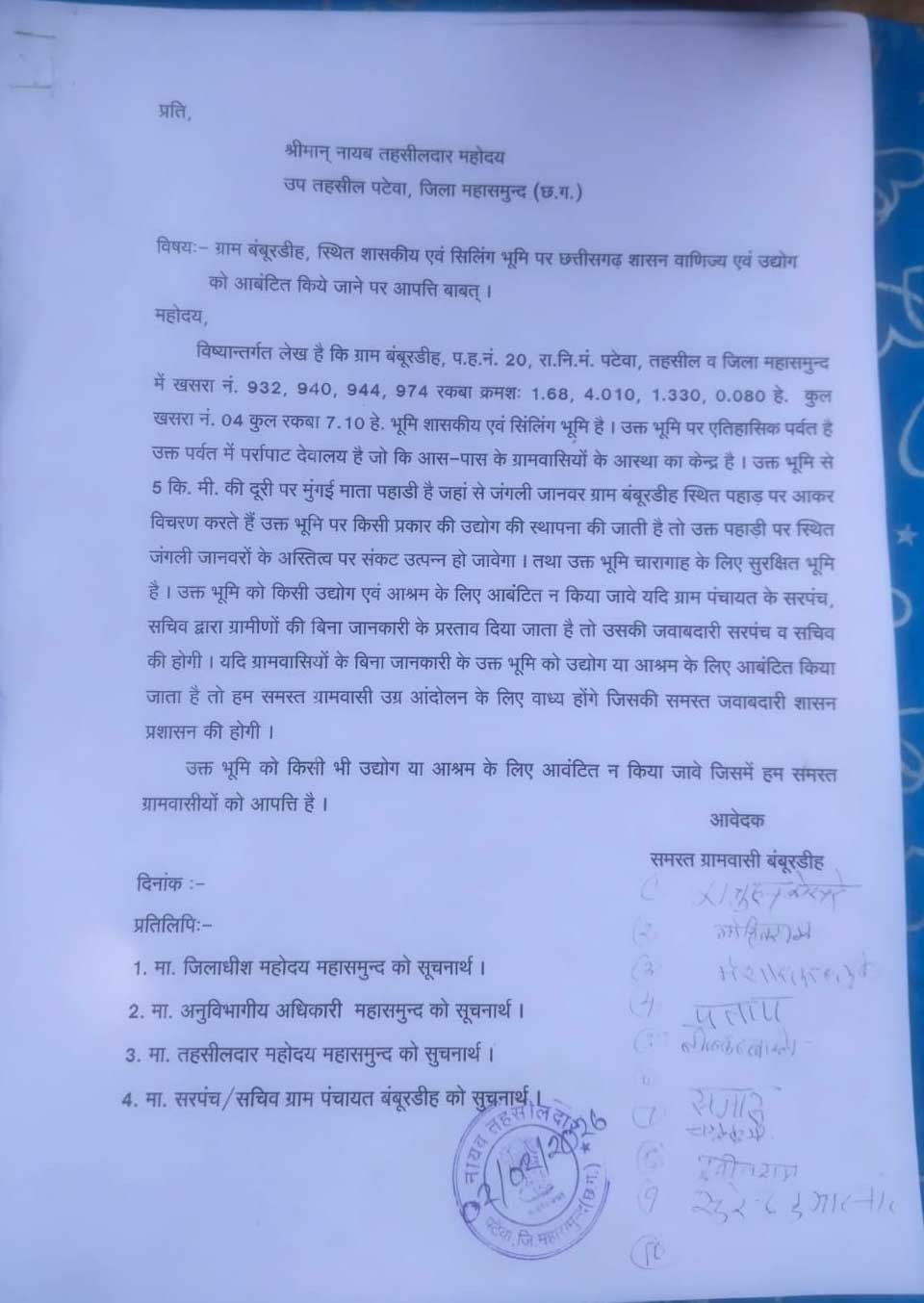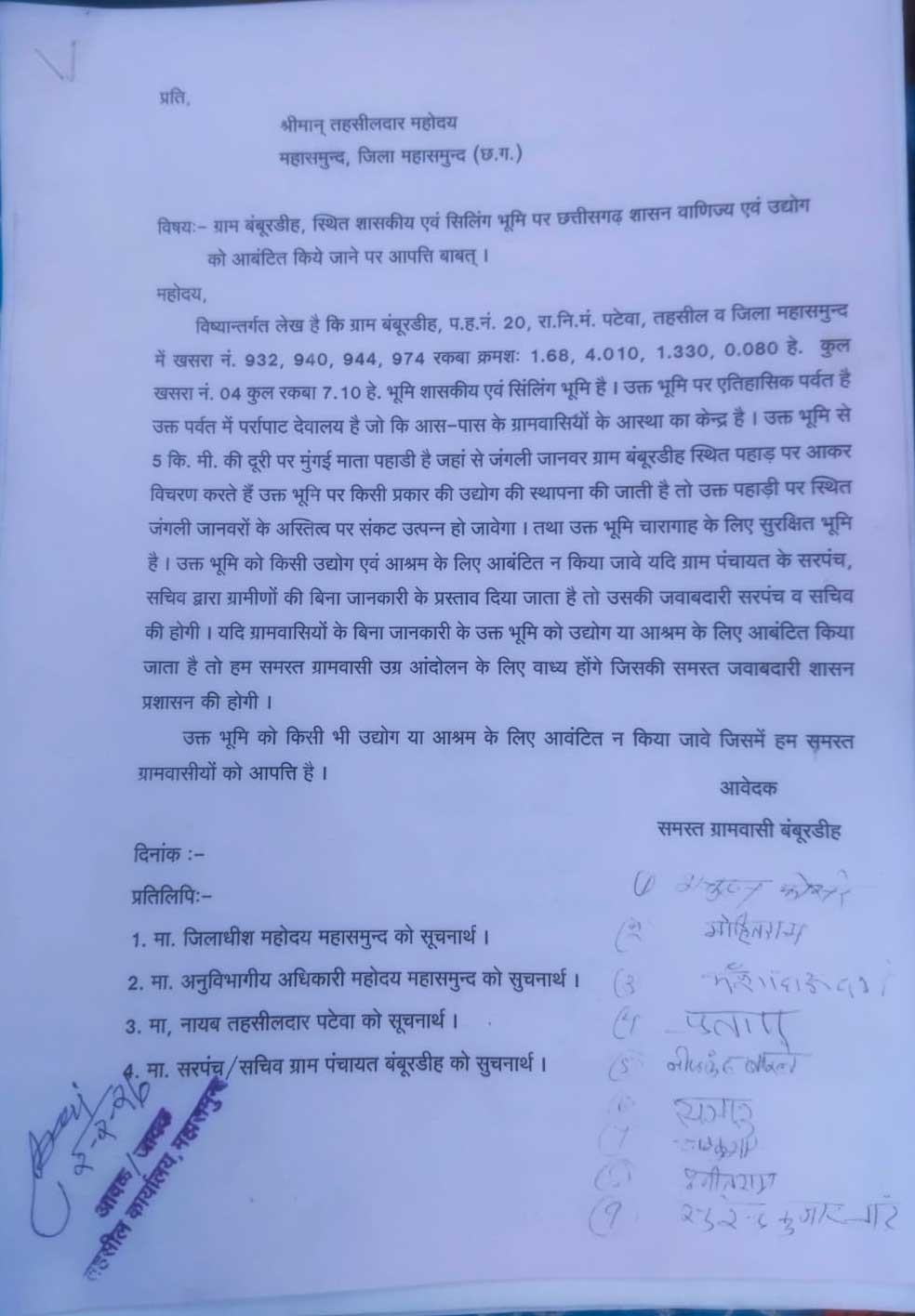 ज़िस पर गॉव वालोने महासमुंद कलेक्टर महोदय तहसीलदार व नायब तहसीलदार के समक्ष लिखित आपत्ति दर्ज कराई.