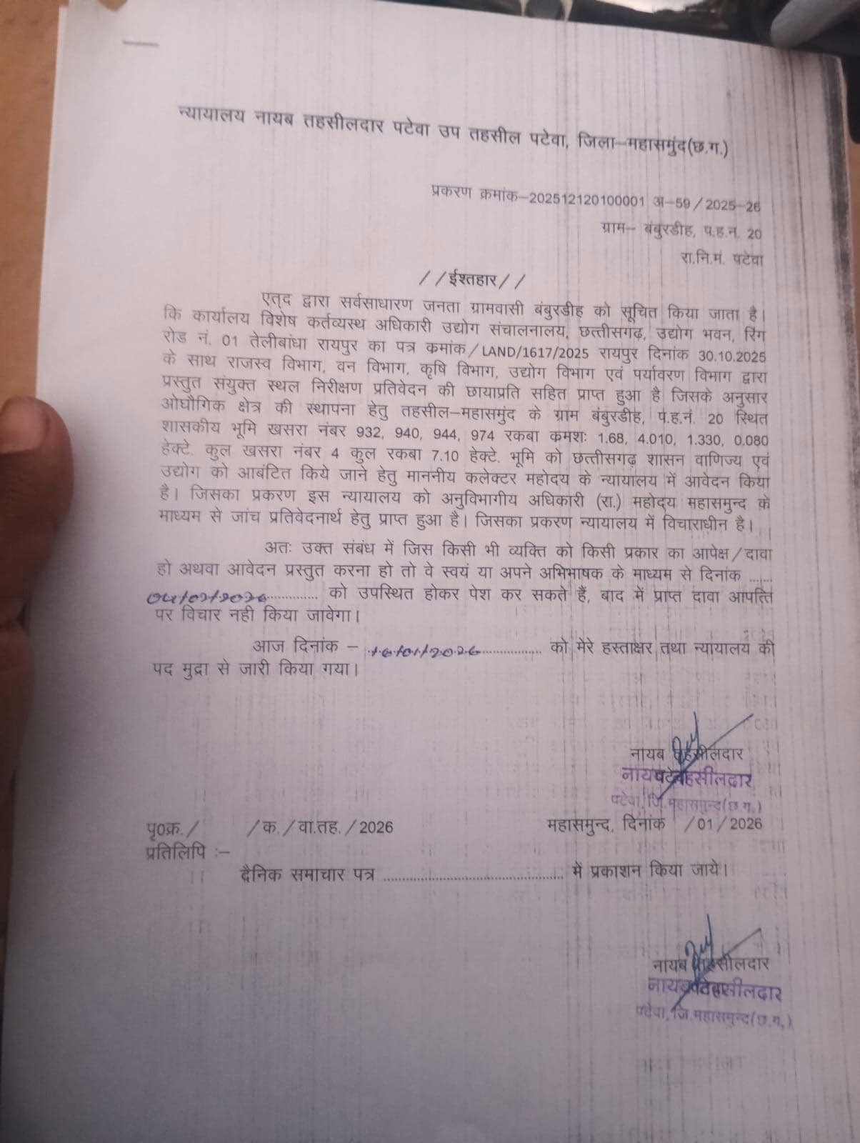महासमुन्द. ग्राम बंबूरडीह, रामाड़बरी मे उद्योग लगने की जानकारी इस्तेहर के माध्यम से हुई की प.ह.नं. 20, रा.नि.मं. पटेवा, तहसील व जिला महासमुन्द में खसरा नं. 932, 940, 944, 974 रकबा क्रमशः 1.68, 4.010, 1.330, 0.080 हे. कुल खसरा नं. 04 कुल रकबा 7.10 हे. भूमि शासकीय एवं सिंलिंग भूमि है।