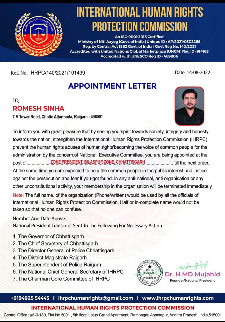 रायगढ़/बिलासपुर . अंतर्राष्ट्रीय मानव अधिकार संरक्षण आयोग के छत्तीसगढ़ प्रदेश अंतर्गत जिला रायगढ़ के जिला अध्यक्ष रोमेश सिन्हा को उनके उत्कृष्ट कार्य, संगठन के प्रति निष्ठा एवं मानव अधिकार संरक्षण के क्षेत्र में किए गए उल्लेखनीय योगदान को देखते हुए पदोन्नत किया गया है।